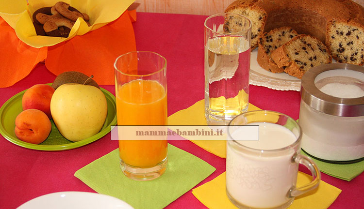I colori sono importanti quanto il cibo che viene messo in tavola. Non vi viene voglia di mangiare? Yogurt con cereali, fette biscottate con la marmellata, latte, succo di frutta, frutta fresca, acqua, un ciambellone con gocce di cioccolata…