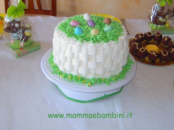 Questa torta l’abbiamo preparata per il giorno di Pasqua ma decorata con dei fiori al posto delle uova colorate la renda molto adatta per i compleanni nel periodo primaverile. Tanto colore e allegria insieme all’indispensabile gusto! La decorazione a canestro e il prato sono stati realizzati con la crema di burro.
