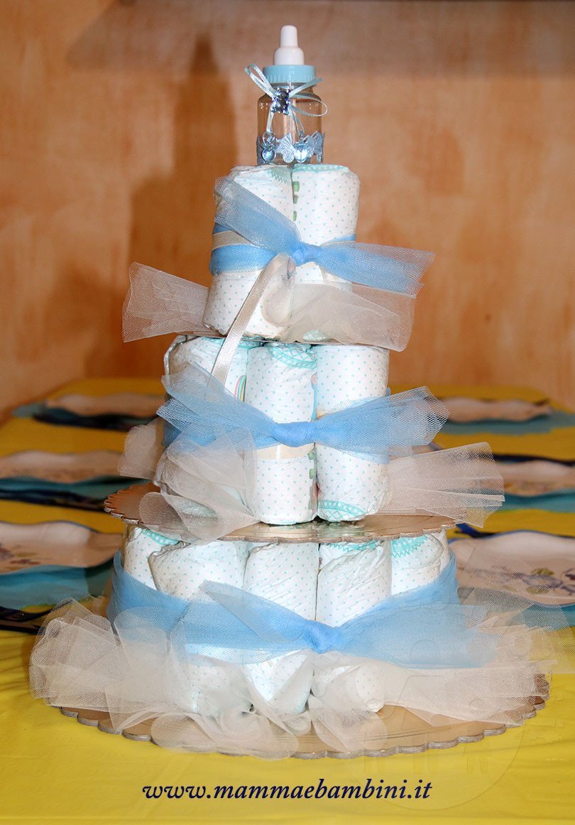 Questa torta su tre piani, quindi procuratevi 3 sottotorta di tre dimensioni diverse, i pannolini e nastrini vari. All’interno potete aggiungere un oggetto (noi abbiamo inserito un piccolo biberon decorativo) come ad esempio un piccolo pupazzo o prodotti per la pulizia del beb.