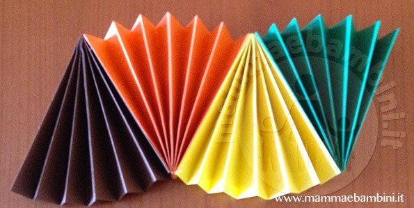 5) dopo aver realizzato i vostri ventagli, si passa ad assemblarli; notate bene il verso che deve essere sempre invertito (punta su- punta gi). Incollare bene i due lati.